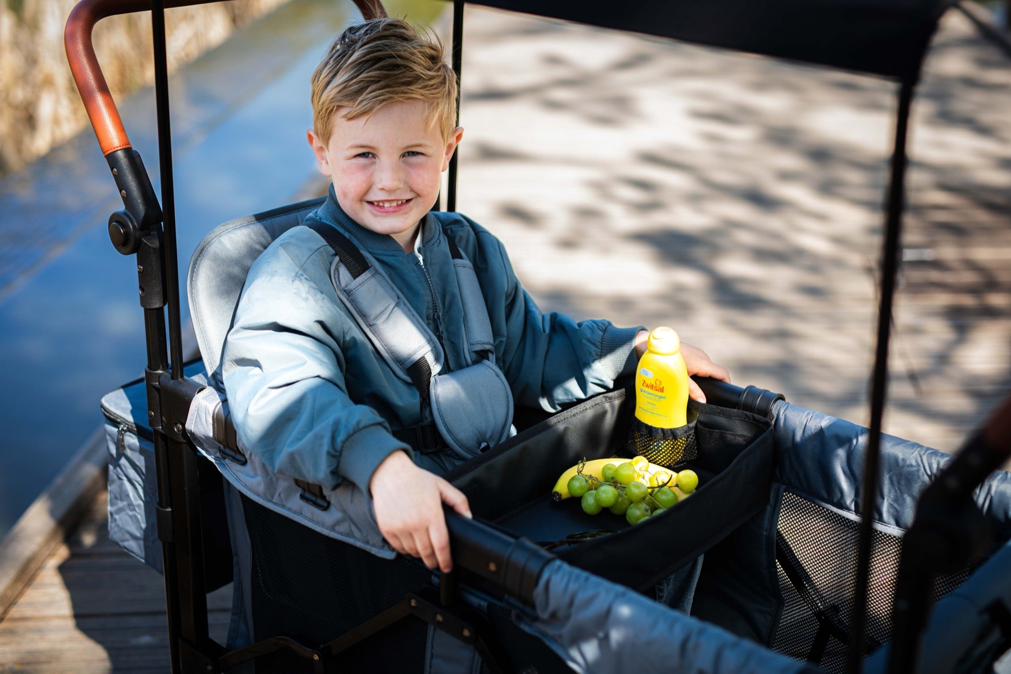 All Mr Fold products are built in consultation with parents and children. Raised seats give little passengers a better view and all-terrain wheels ensure a smooth ride wherever your adventures take you. Five-point magnetic harnesses, one-step foot brakes and sun canopies protect your precious cargo. Thanks to the many storage options, you can take all your essentials with you, such as snacks, cups and sunscreen.