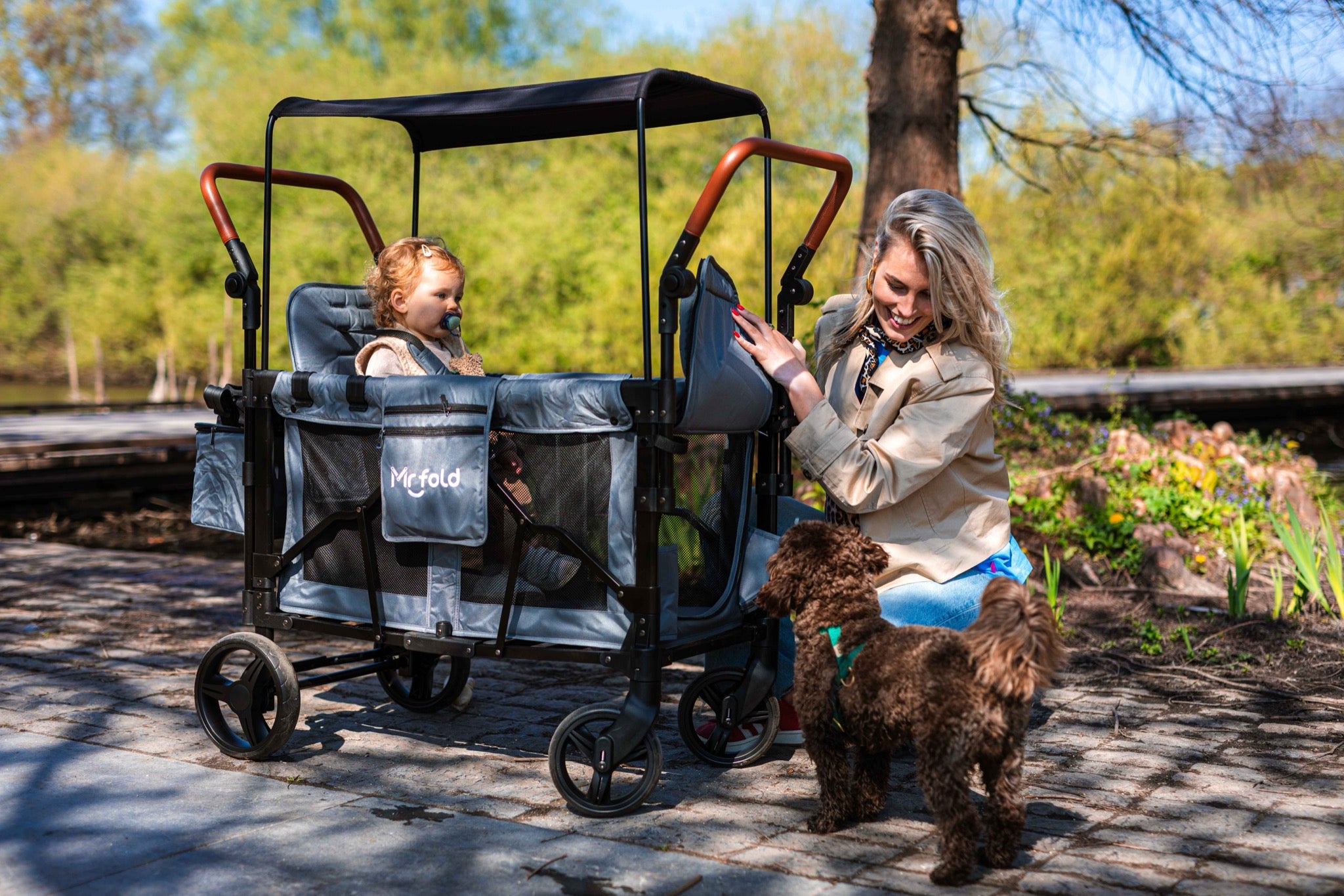 Mr Fold originally started as a way to carry things to the beach, the mountains or anywhere in between. Then we noticed that parents were also carrying their children in the wagon, even though the wagon was not designed to carry precious cargo. That's when we decided to combine the convenience of a wagon with the safety and ease of a stroller, and the concept evolved into the Mr fold wagons of today!