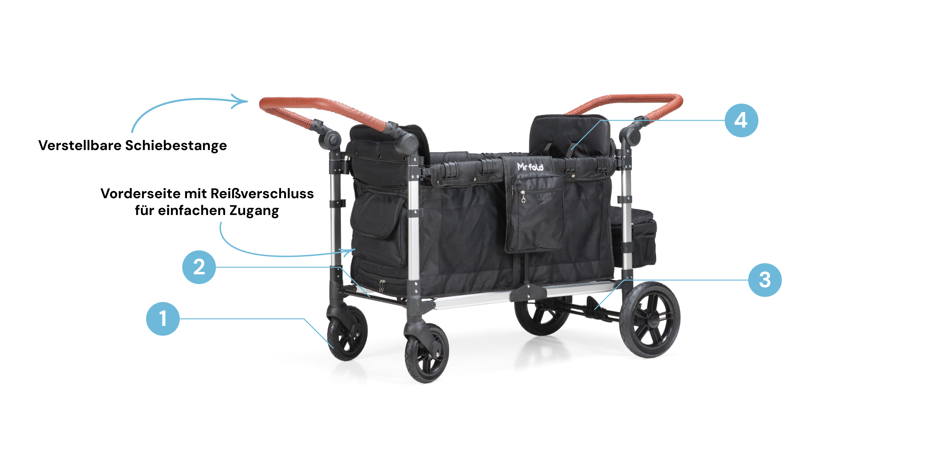 De kinderkar wordt standaard geleverd met het zonnedak, de bankjes en de opbergtassen, zoals getoond op de productafbeeldingen.