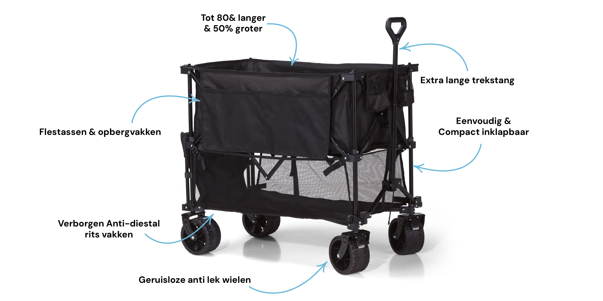 Of je nu met kinderen op pad gaat of zware spullen wilt vervoeren — onze kinderwagens en bolderkarren combineren comfort, veiligheid en gebruiksgemak met een strak, modern design.