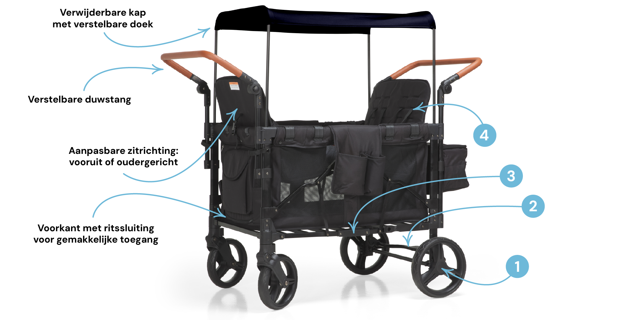 De kinderkar wordt standaard geleverd met het zonnedak, de bankjes en de opbergtassen, zoals getoond op de productafbeeldingen.